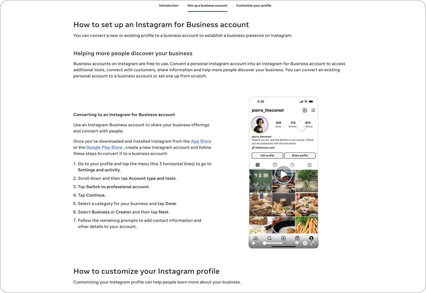 As part of the course creation process, I create all of the assets needed to ensure the course objectives are clearly communicated with visual scaffolding. After building the shell of the course and placing all of the copy from the storyboard, I created all of the UIs and a video walkthrough using Figma and After Effects. I also designed the hero image to highlight the benefits of using an Instagram business account with bits of stylized UI.